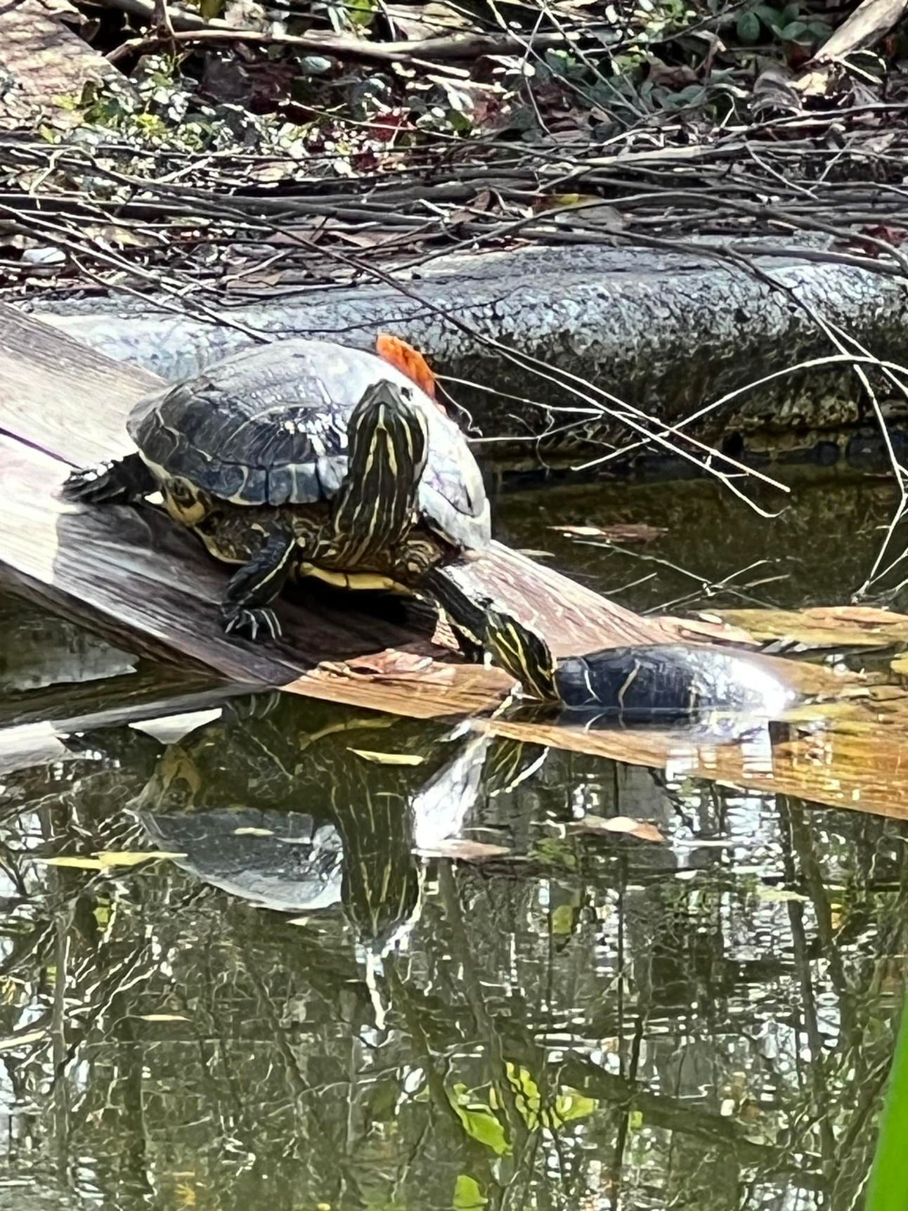 We strongly suspect Poot is the female, PJ the male, and who knows what the baby is. We've got a ramp built for both escape and sunning, and they spend most of their time on it. Poot also tends to wander off into the woods behind the fence for a few weeks once or twice a year.