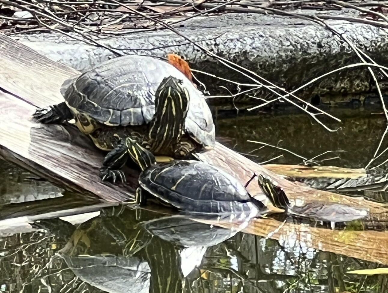 Our pool turtles have emerged from brumation, the reptile version of hibernation. It's a sure sign of spring -- or at least a temporary spring -- at the Wood Backyard.